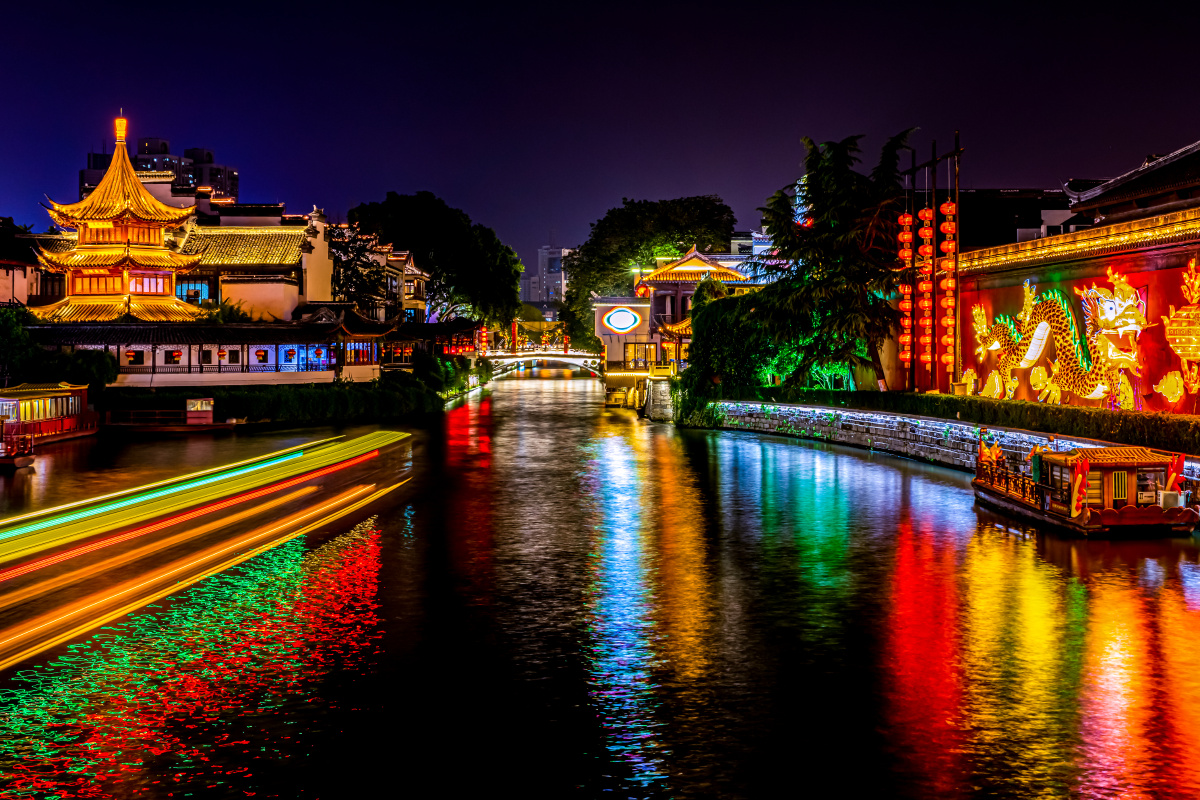 離開牛首山,我們前往充滿老南京風情的老門東歷史文化街區(qū)。青石板路蜿蜒向前,兩側是白墻黛瓦的明清風格建筑,濃郁的市井氣息撲面而來。大家或在 “老門東” 牌坊下合影留念,或走進沿街店鋪品嘗各類南京美食。晚餐后我們來到了夫子廟 - 秦淮風光帶。此時的秦淮河畔早已華燈初上,岸邊的古建筑掛滿了紅燈籠,燈光倒映在河水中,波光粼粼,美不勝收。我們沿著秦淮河畔漫步,看畫舫緩緩駛過,晚風吹拂,愜意十足。街邊的小吃攤前人頭攢動,糖芋苗、赤豆元宵的香甜氣息縈繞鼻尖,大家三三兩兩分享美食,歡聲笑語回蕩在秦淮河畔。