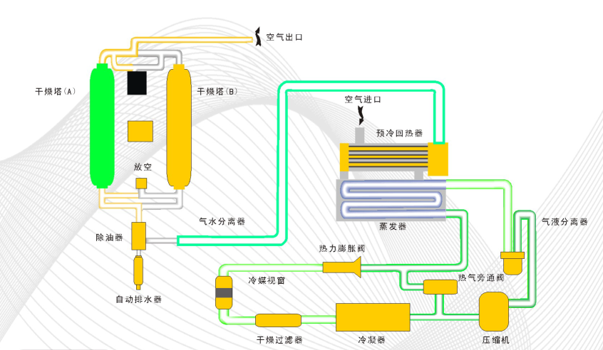 組合式干燥機(jī)是一種新型的壓縮空氣干燥裝置,它由冷凍式干燥機(jī)、吸附式干燥機(jī)組合而成。冷凍式干燥機(jī)可去除85%的濕空氣,吸附式干燥機(jī)去除其他的水份,最后達(dá)到-70℃露點(diǎn)。